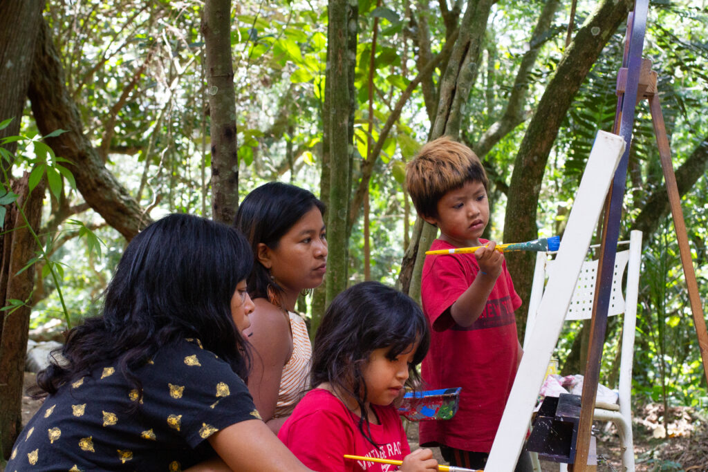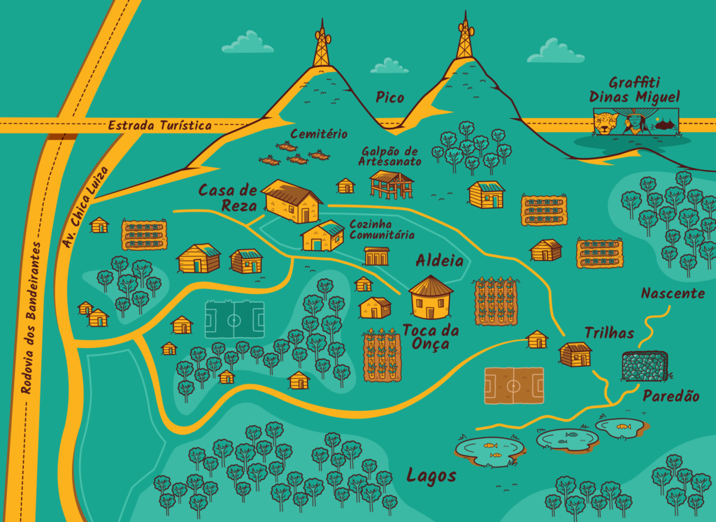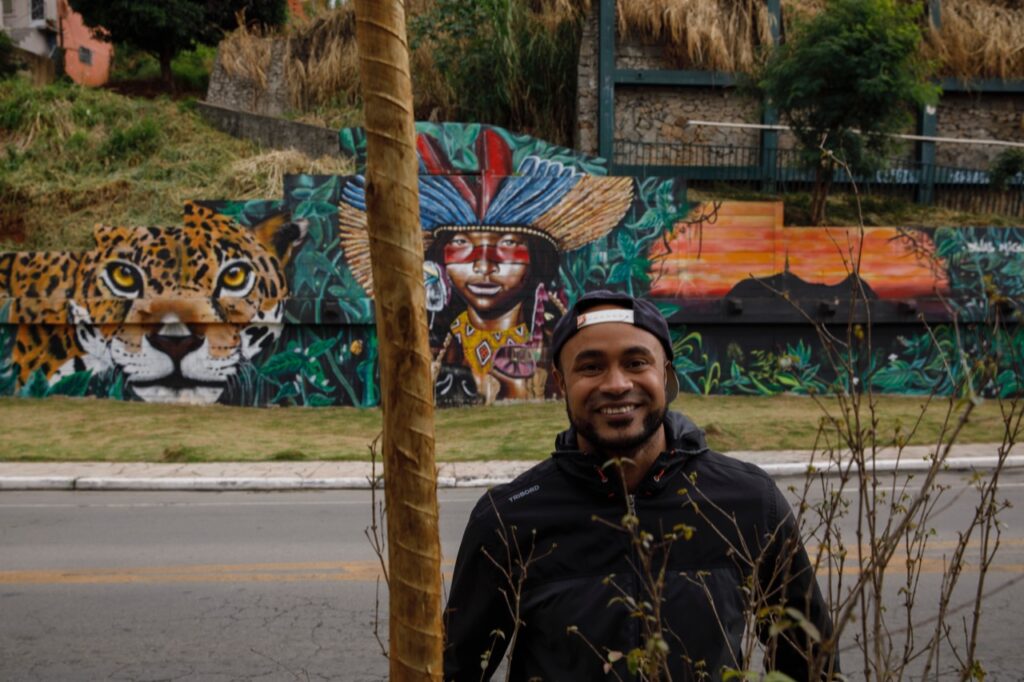 A aproximação com a comunidade Guarani Mbya aconteceu por meio do grafiteiro, educador e artista visual Dinas Miguel, que mantém uma relação sólida de parceria com a aldeia e é um dos idealizadores do projeto.