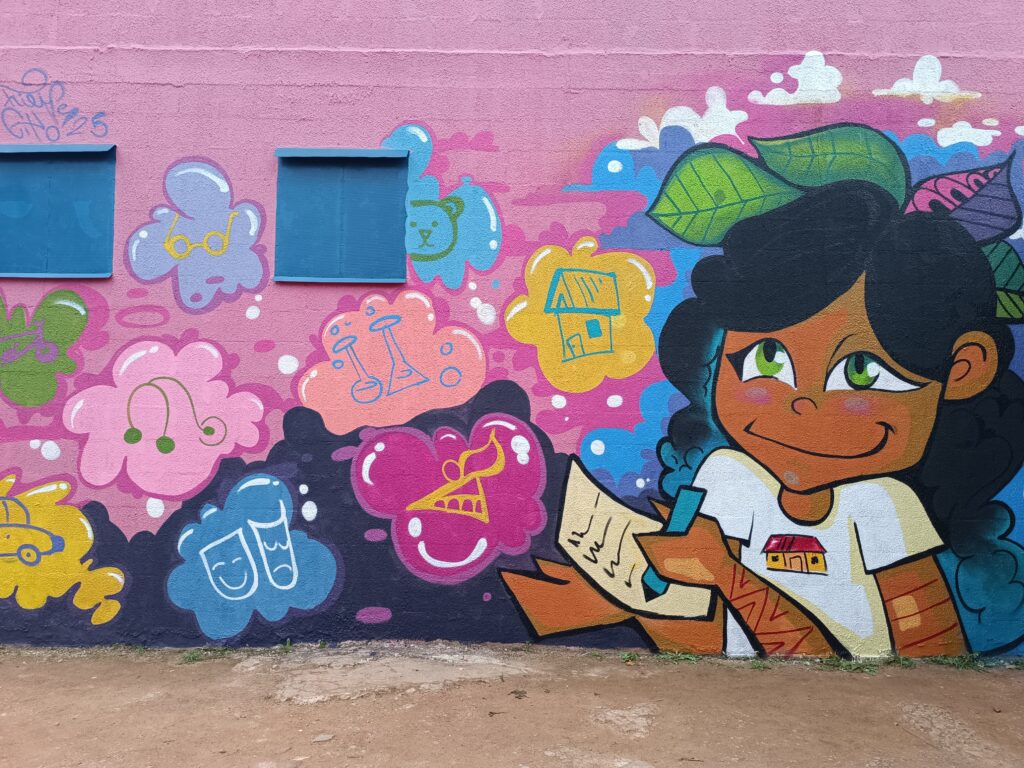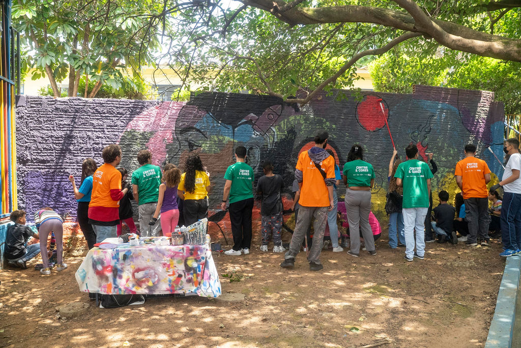 Em cada encontro final, foi realizado um mural de grafitti coletivo, envolvendo em média 120 a 150 participantes por ação. Ao todo, 11 artistas conduziram os murais, materializando em imagens os sonhos das crianças. Cada obra foi pintada por várias mãos, carregada de cores, significados e boas energias, transformando muros em espaços de expressão, esperança e identidade.