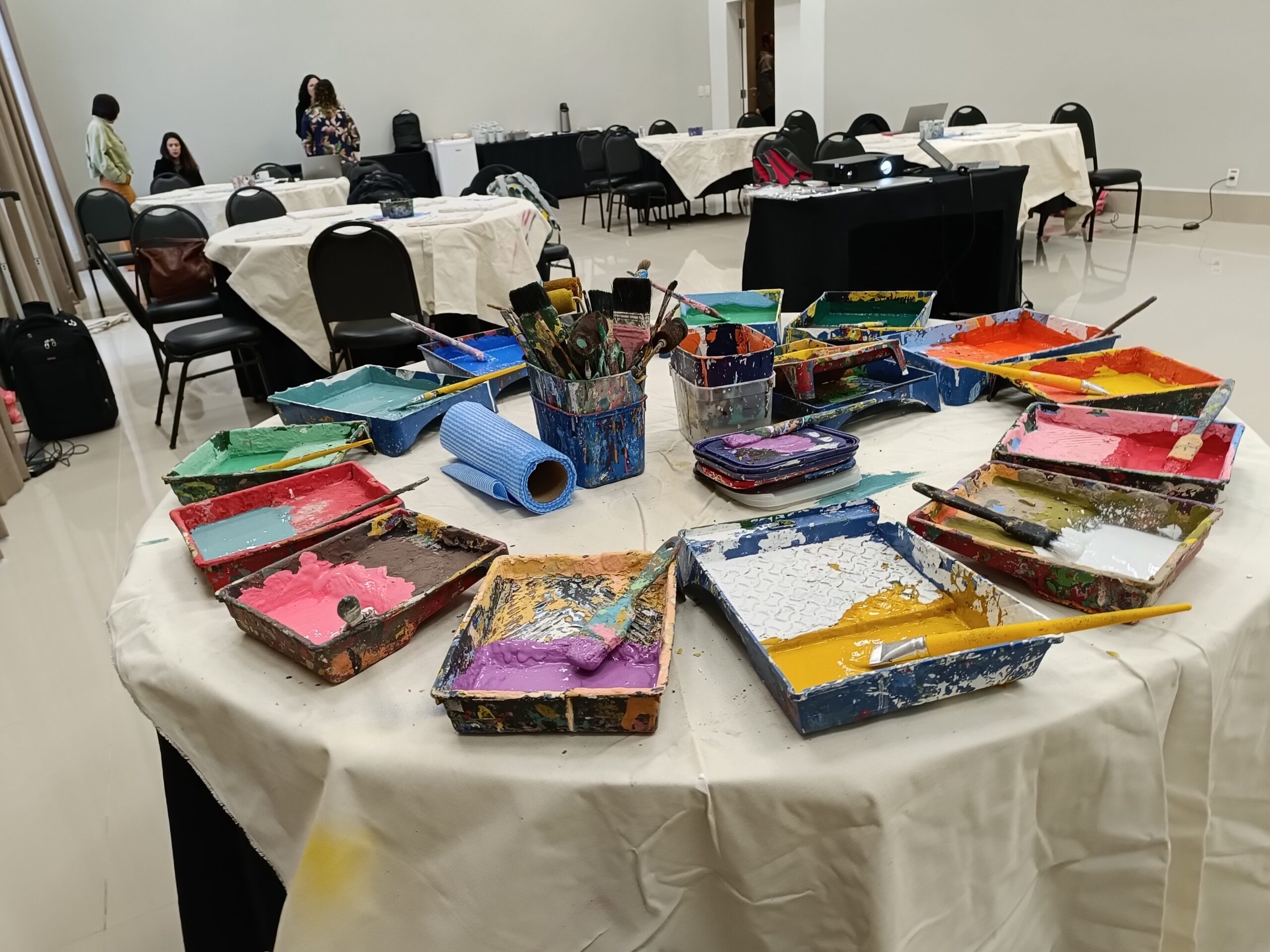 Após um briefing inicial, as equipes são formadas e recebem um kit completo com tintas, pincéis, rolinhos e bandejas.