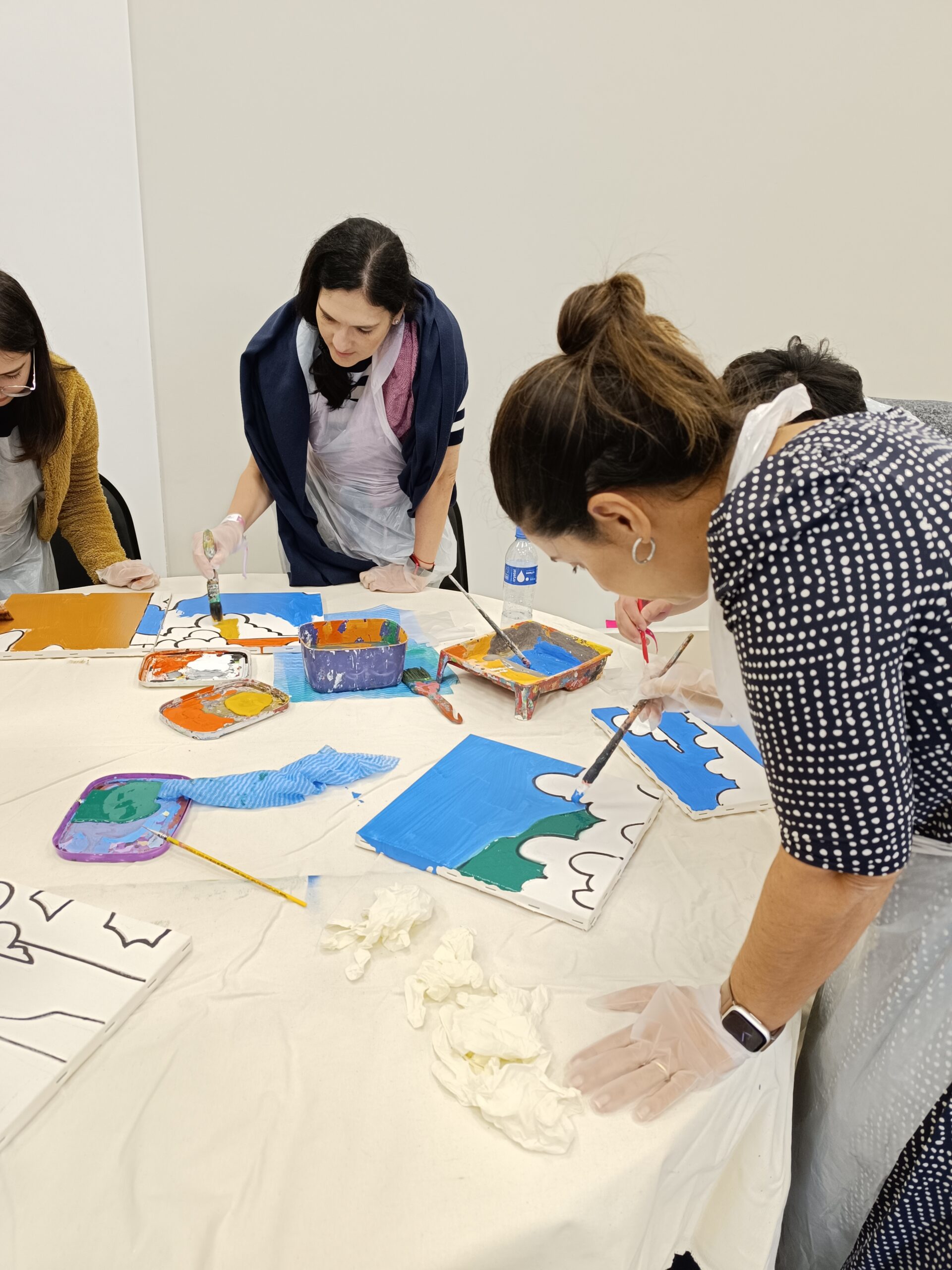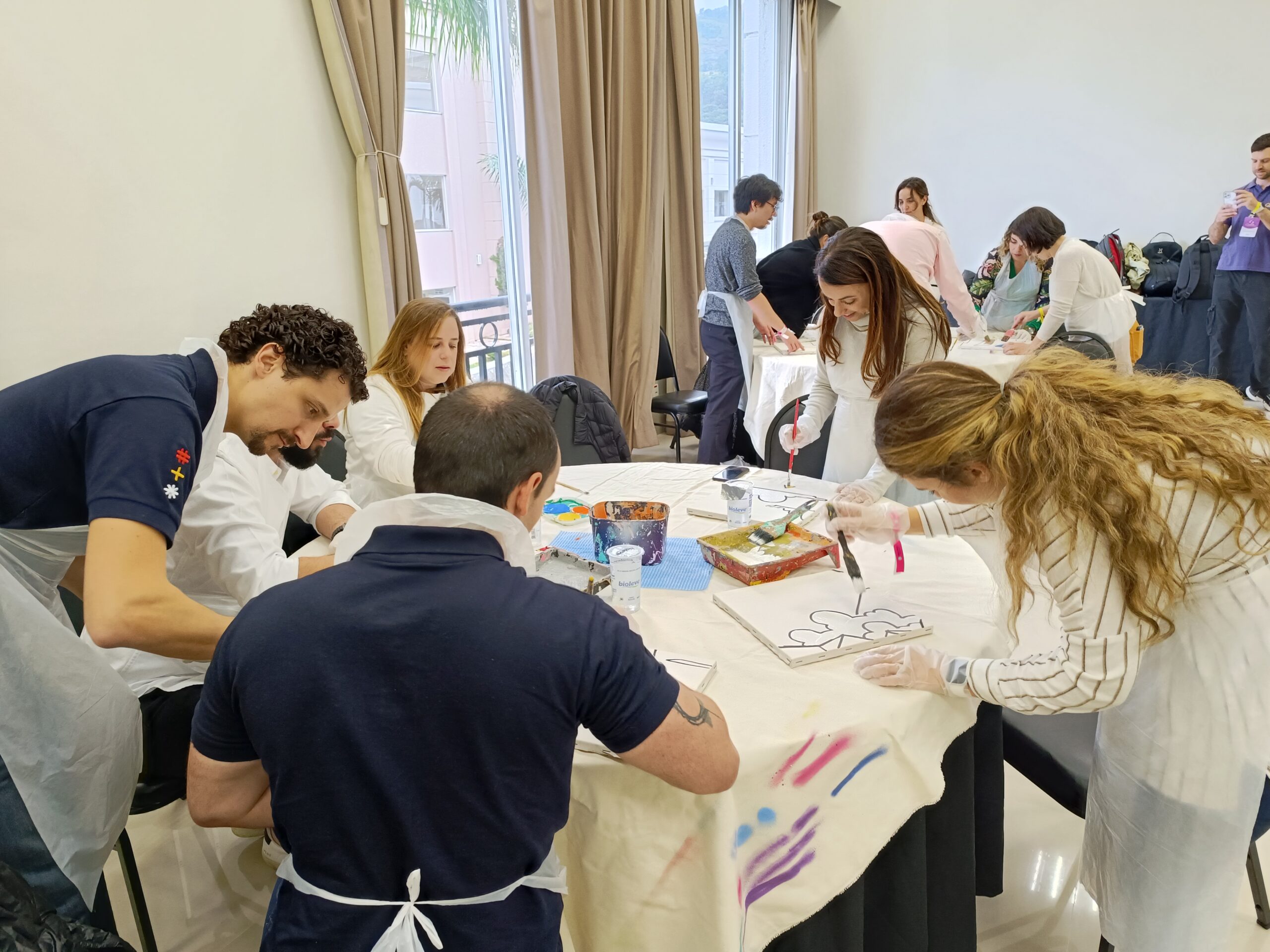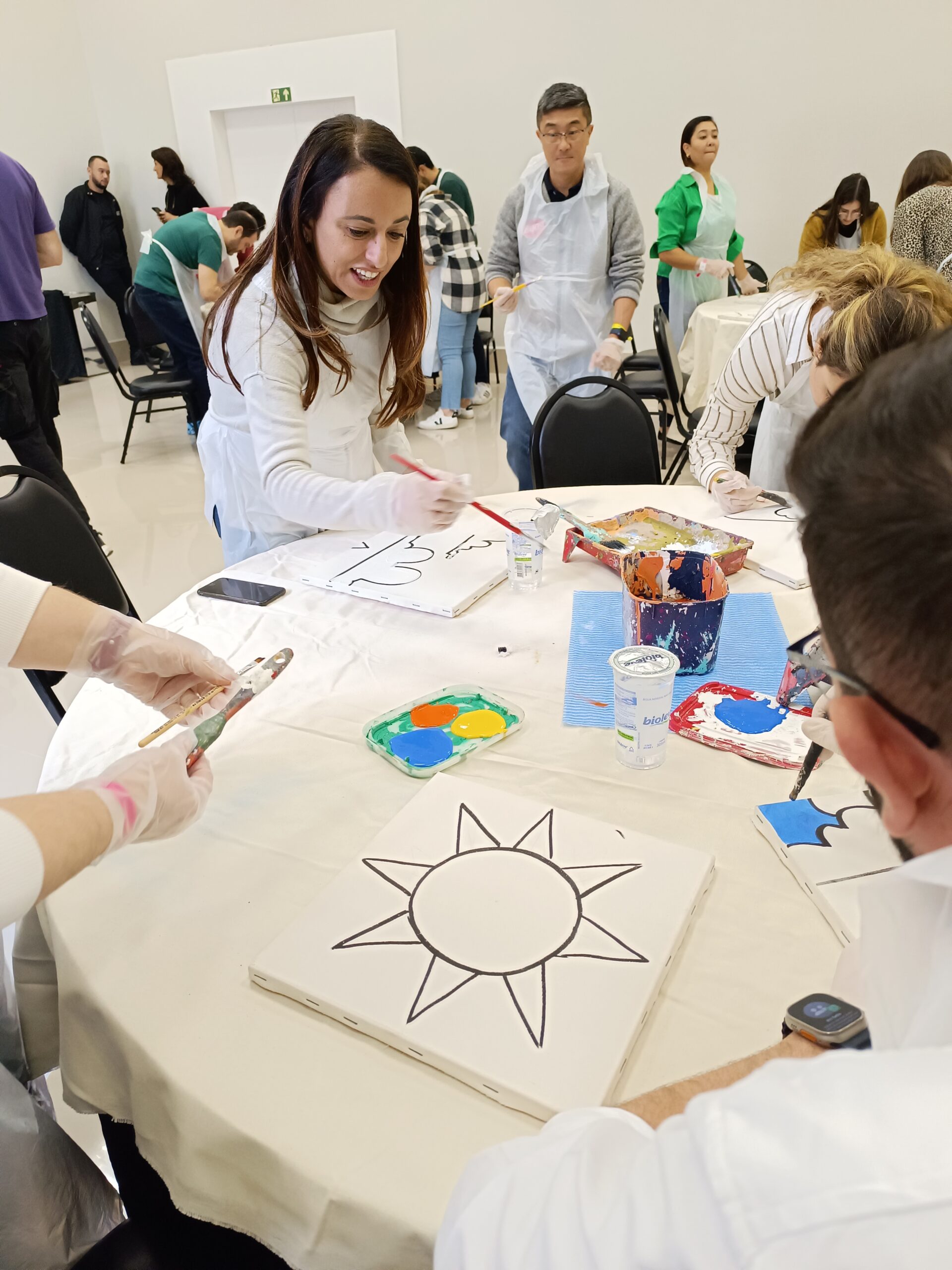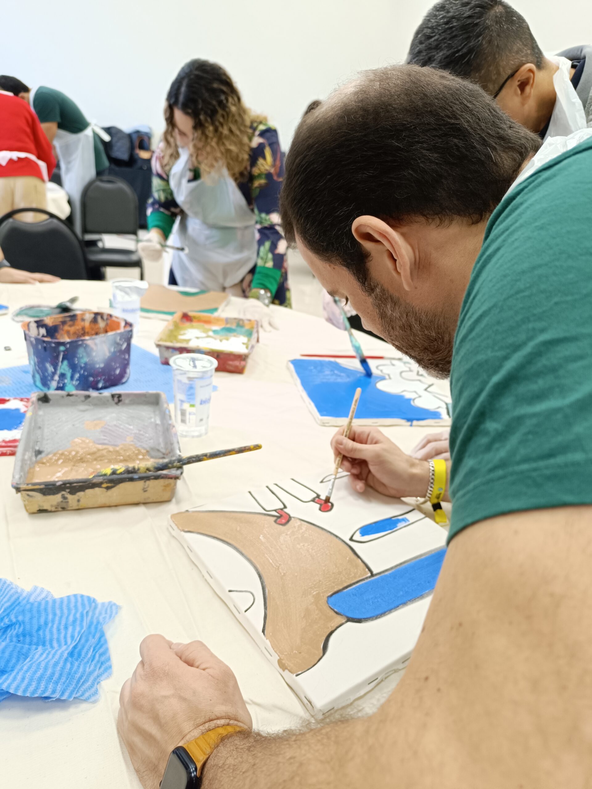 - Os participantes trocam de lugar ao longo do processo, dando continuidade à pintura iniciada por outro colega
