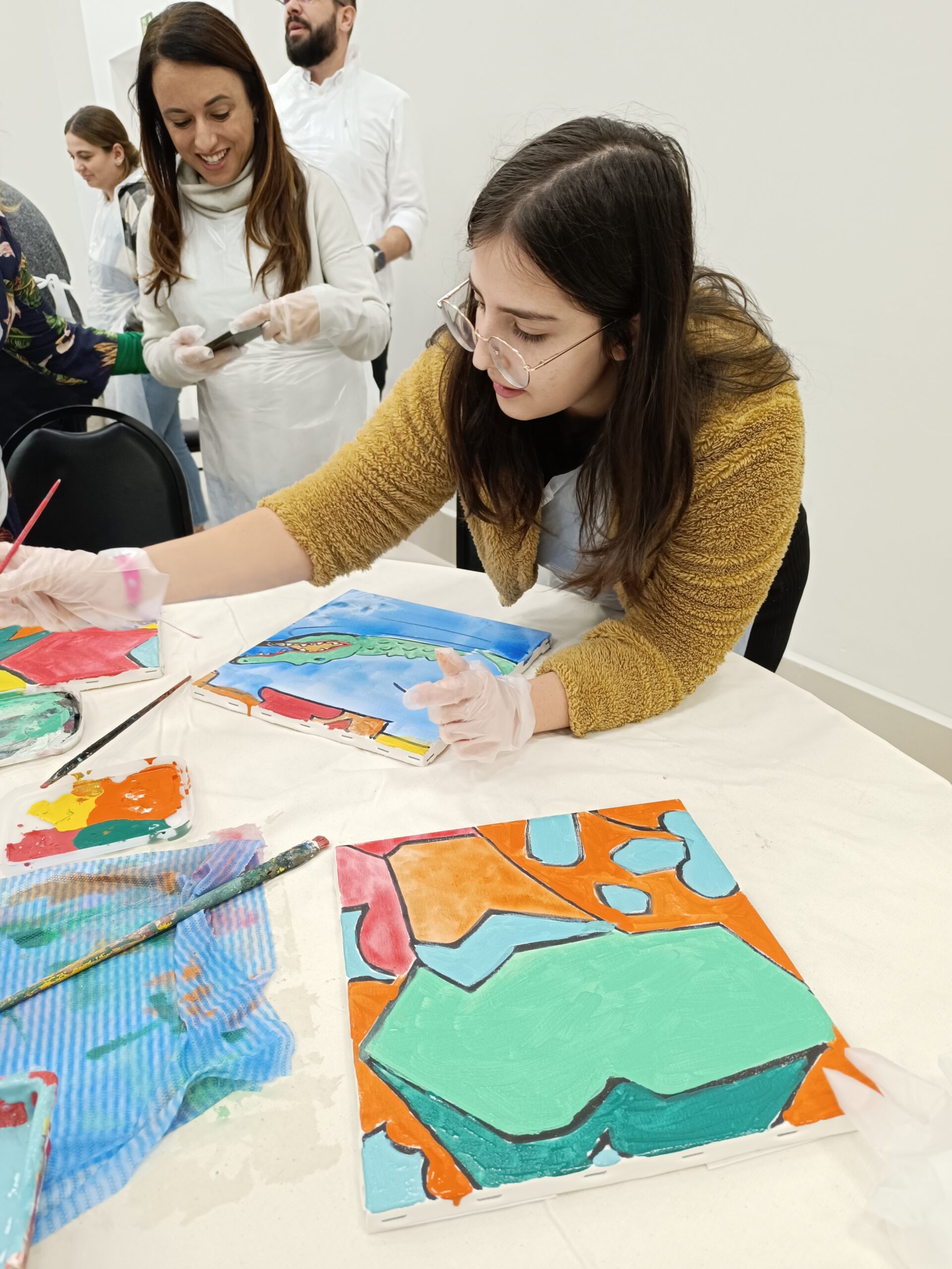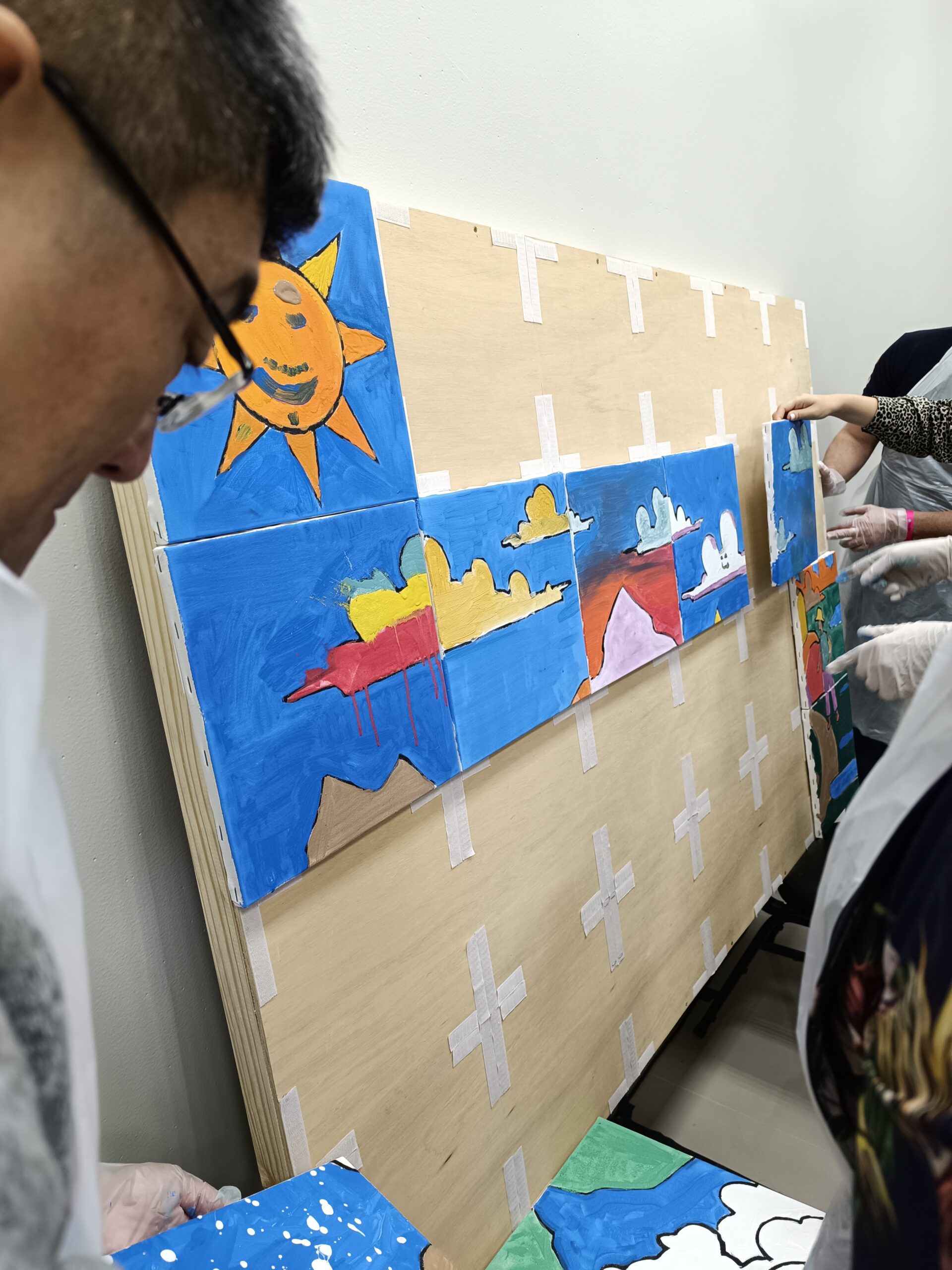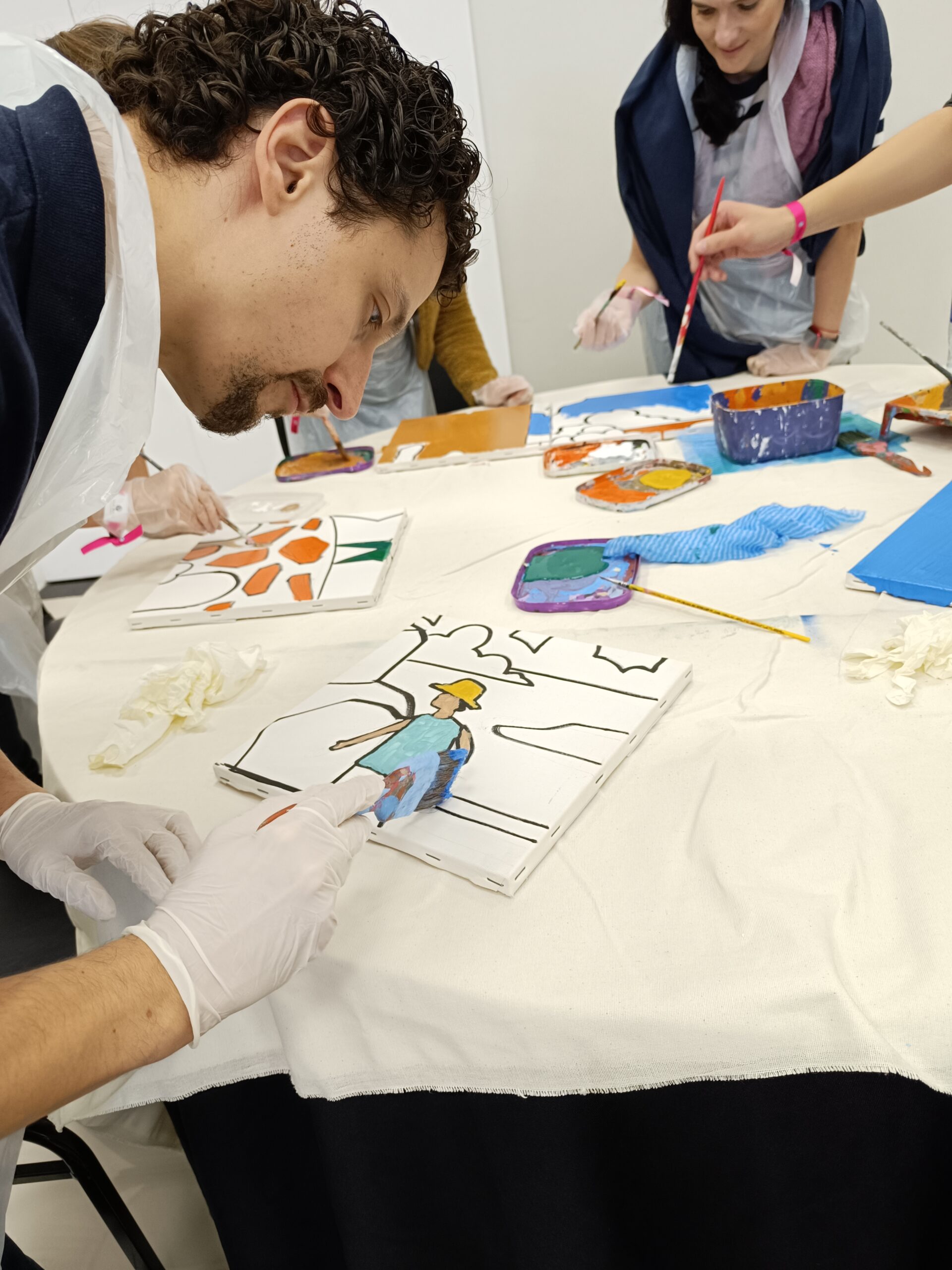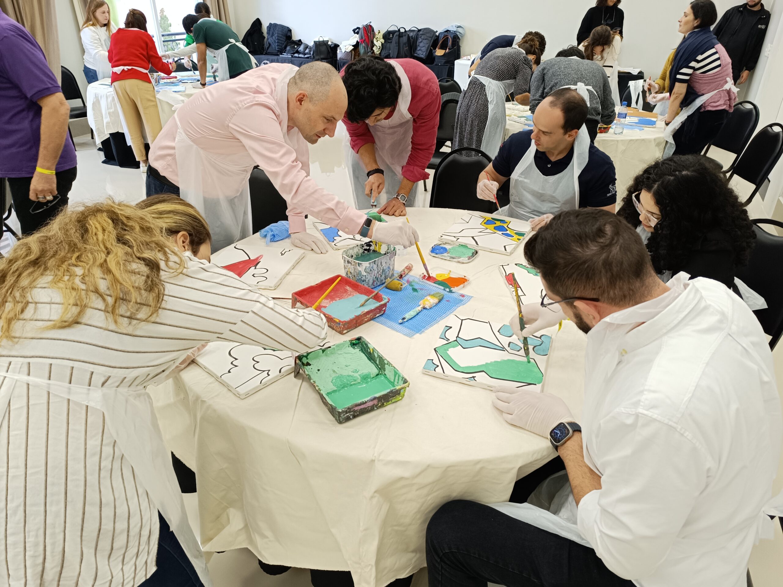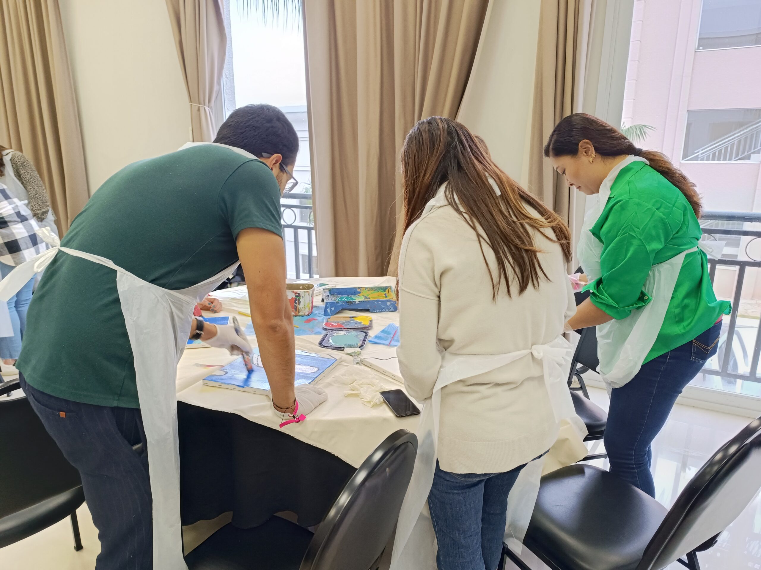 - Os participantes trocam de lugar ao longo do processo, dando continuidade à pintura iniciada por outro colega