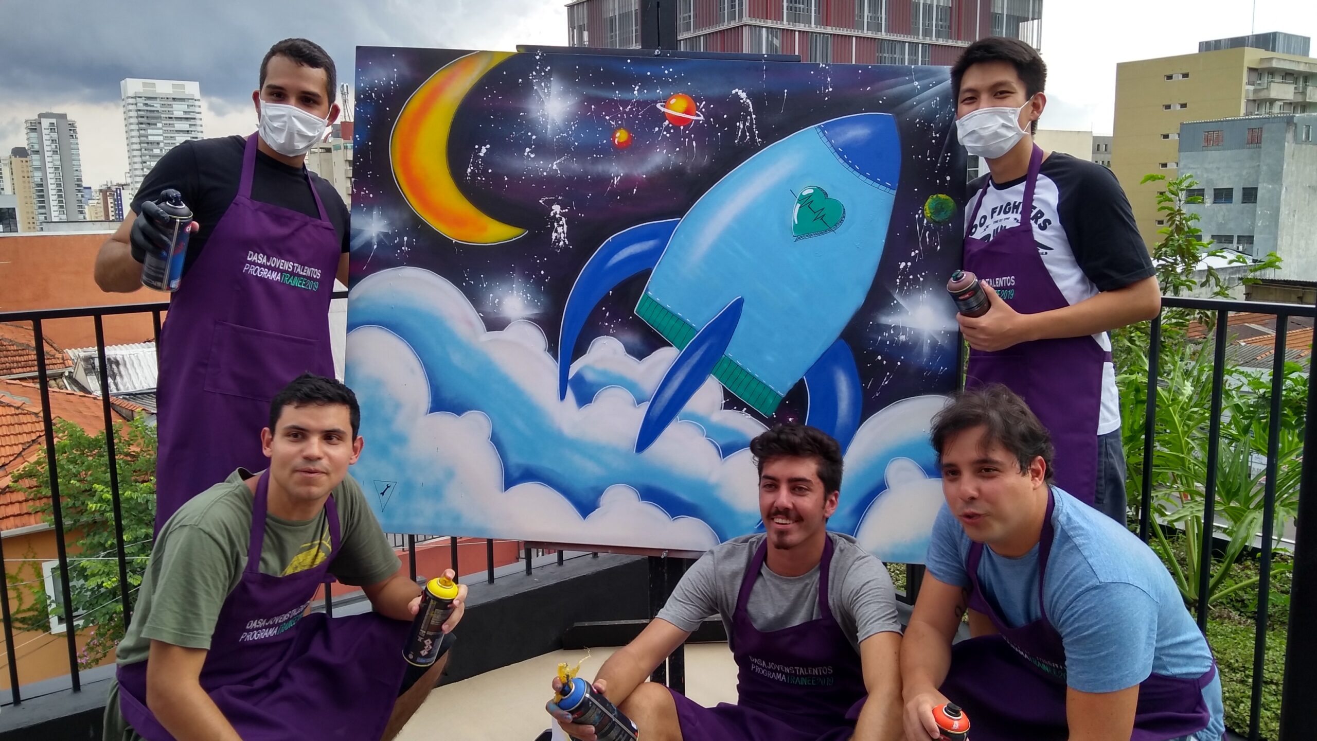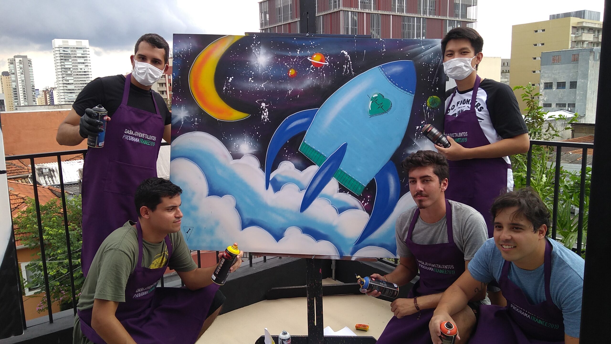 A proposta pode envolver a transformação de um espaço corporativo — como áreas comuns, salas de convivência ou ambientes institucionais — criando um novo visual que represente os valores e a identidade da empresa, ou em um tecido ou telas que depois também pode compor o ambiente de trabalho.
