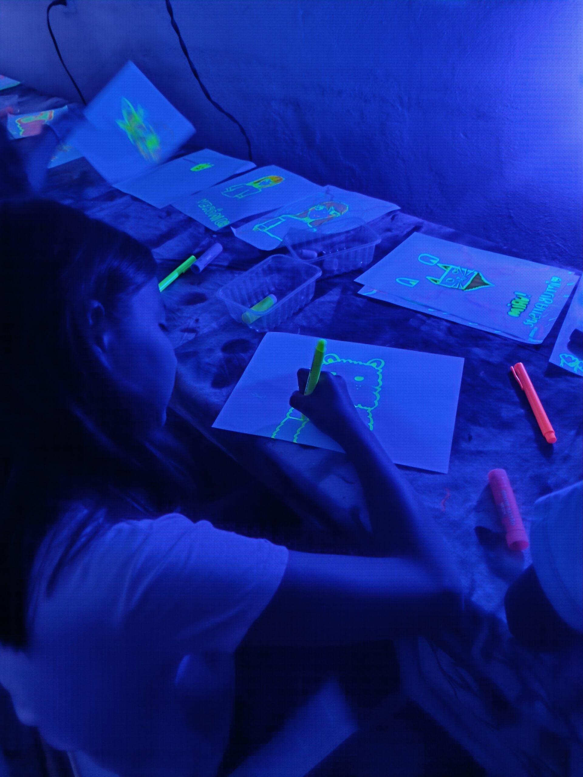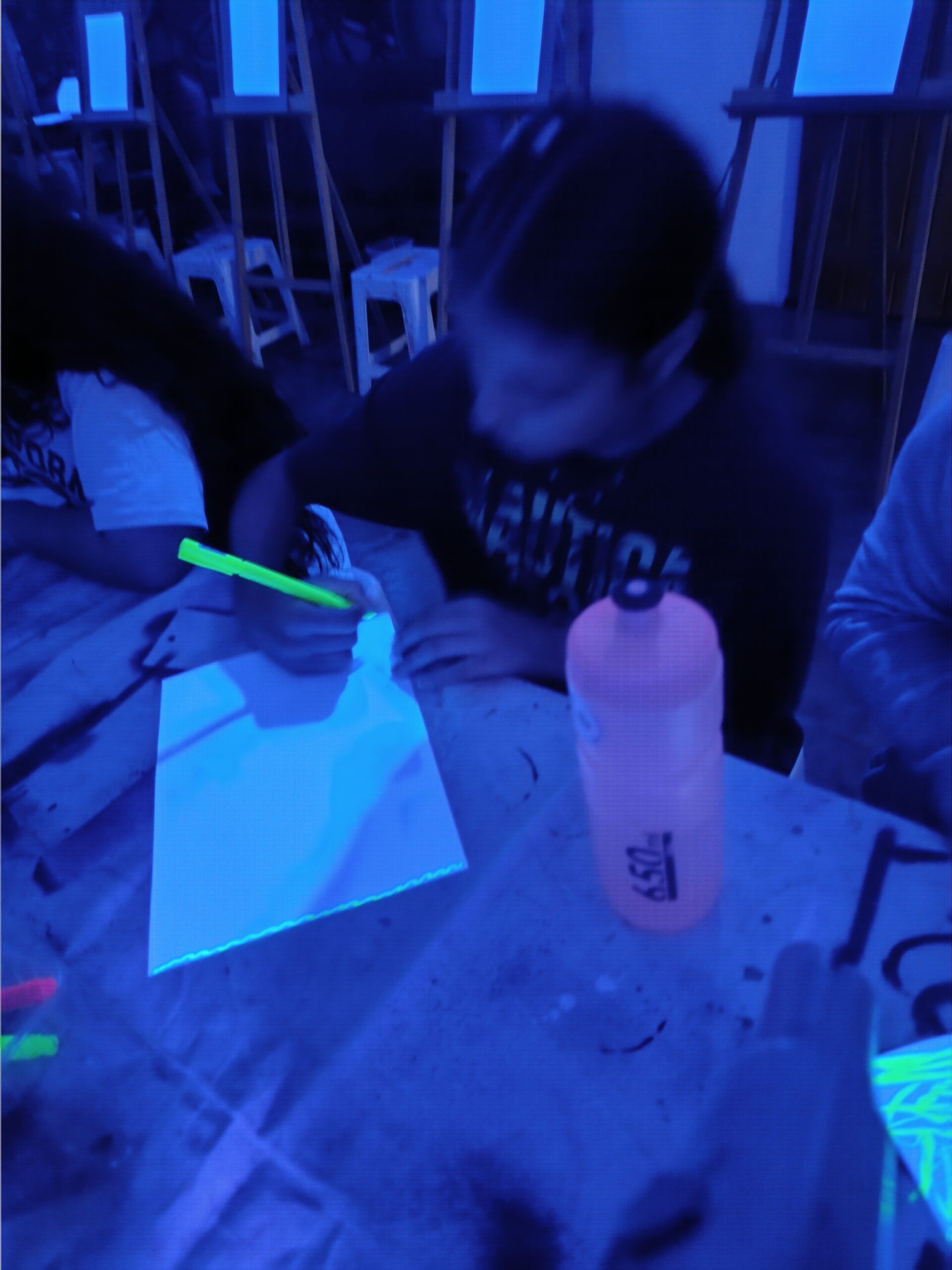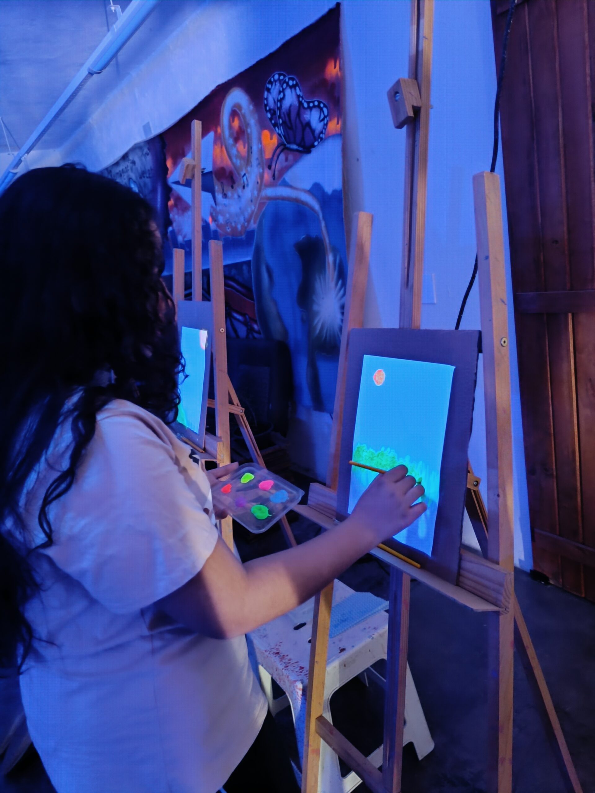 Cada participante recebe um kit especial de pinceis, canetas, marcadores e tintas neon que brilham no escuro, permitindo experimentar cores vibrantes que ganham vida sob a iluminação especial do ambiente. O espaço é cuidadosamente preparado, com luzes neon que criam uma atmosfera envolvente e mágica.