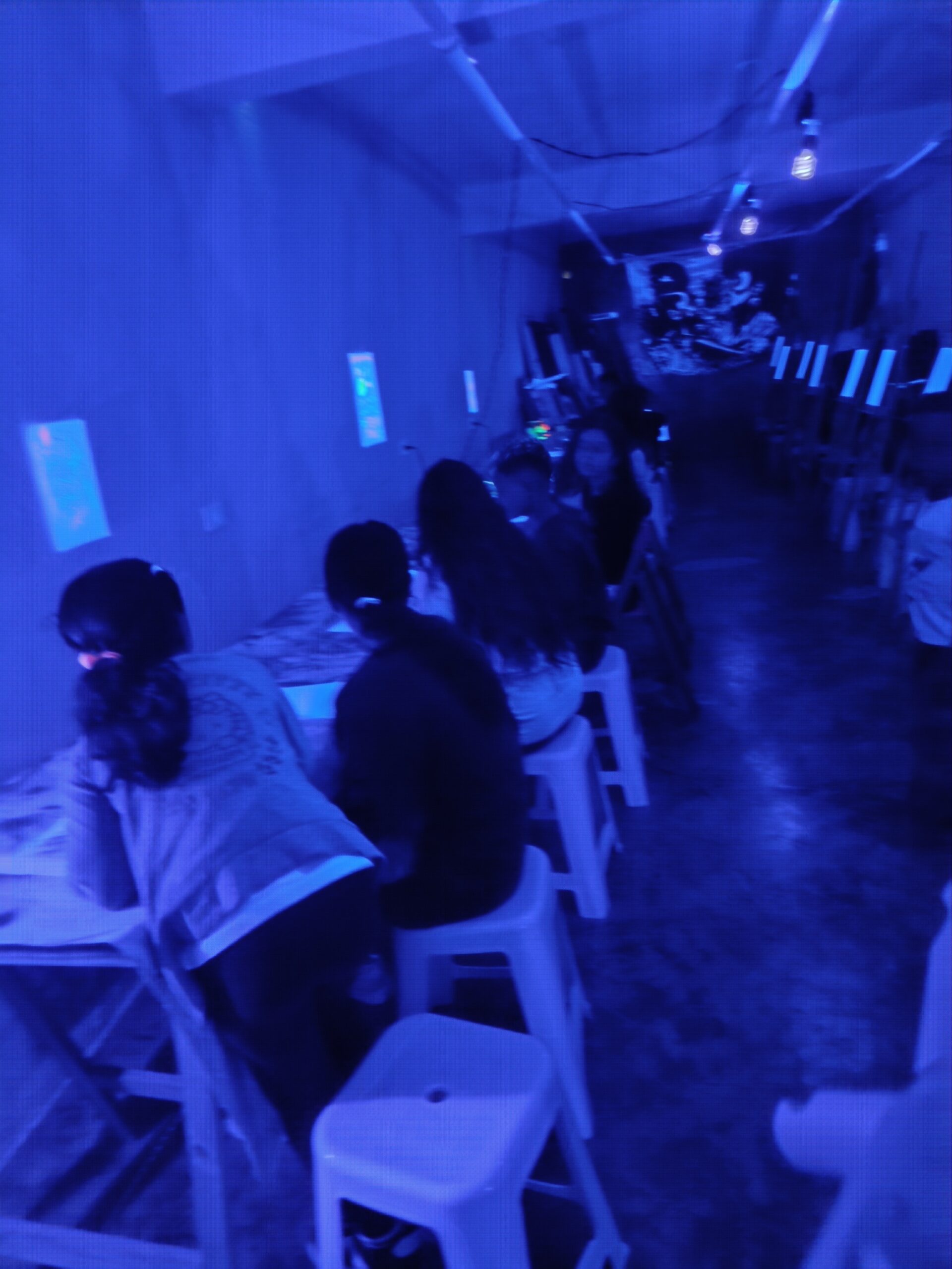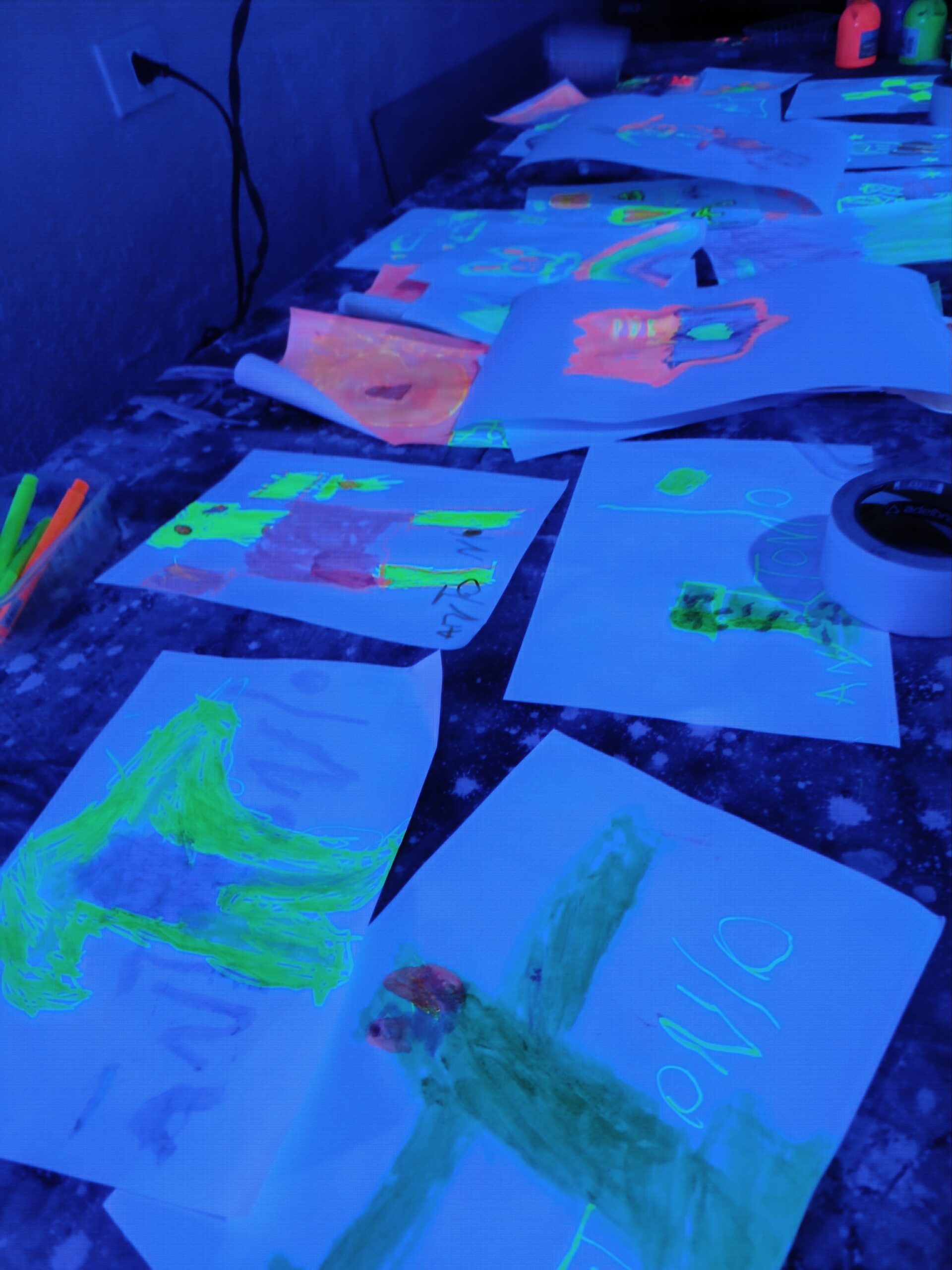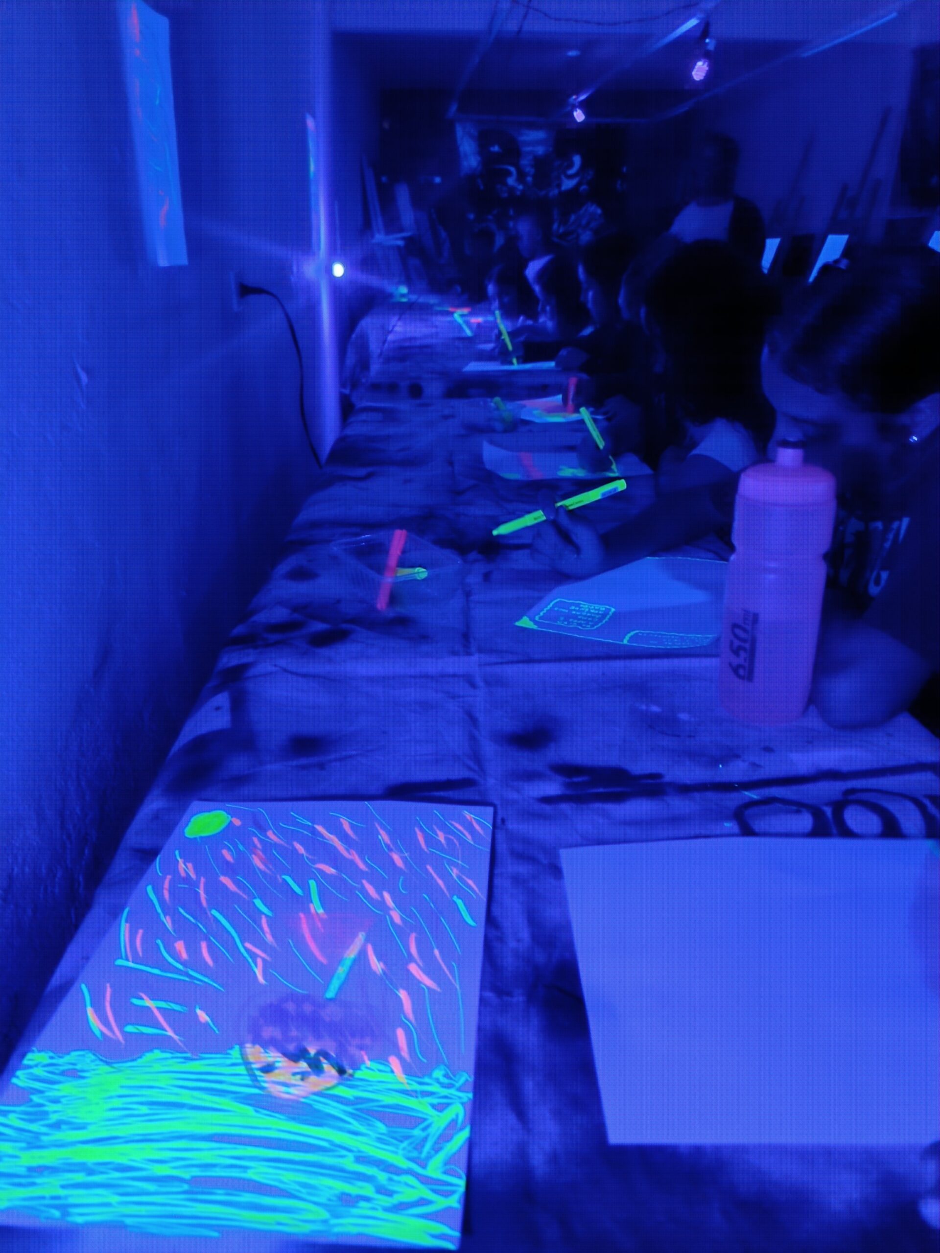 Cada participante recebe um kit especial de pinceis, canetas, marcadores e tintas neon que brilham no escuro, permitindo experimentar cores vibrantes que ganham vida sob a iluminação especial do ambiente. O espaço é cuidadosamente preparado, com luzes neon que criam uma atmosfera envolvente e mágica.